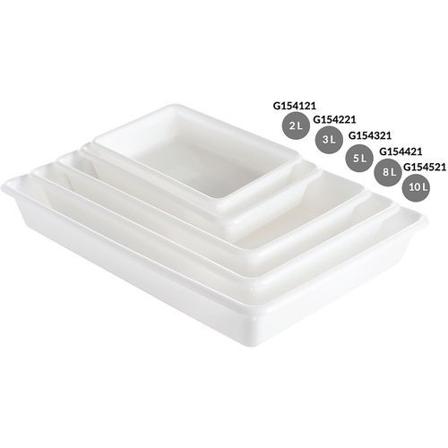 Contenitore piatto multiuso per alimenti: preparazione, marinatura, decantazione, scongelamento, stoccaggio di campioni di controllo... Studiato specificatamente per l'industria alimentare. Ingombro minimo grazie alla possibilità d'incastro a vuoto. formato adatto ai frigoriferi.