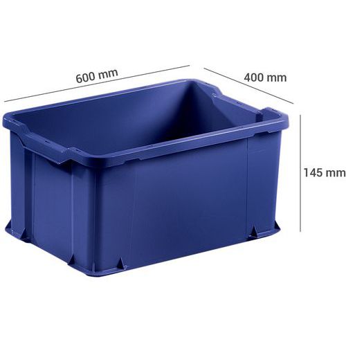 Fondo e pareti spessi per una maggiore solidità. Contenitore impilabile perfettamente igienico per uno stoccaggio sicuro dei vostri prodotti. Trasporto sicuro grazie alle maniglie rinforzate. Massima stabilità sui trasportatori grazie al fondo piatto. Realizzato nell'UE Garanzia Cliente : 3 anni Carico max. (kg) : 35 kg
