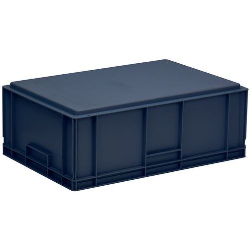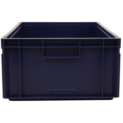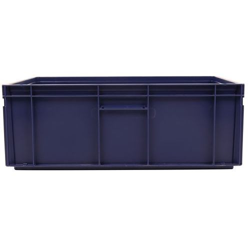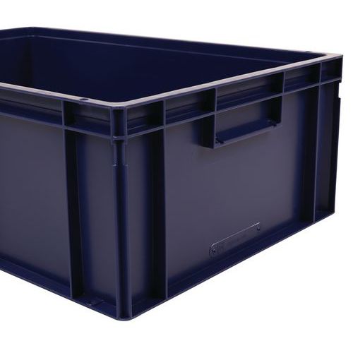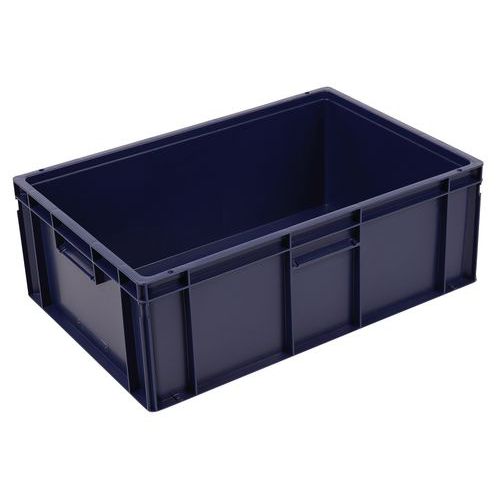 Contenitore a norma europea ad alta stabilità adatto all'impilaggio. Maniglie chiuse: movimentazione facilitata, capacità preservata. Resistente agli oli, ai grassi e a numerosi prodotti chimici.