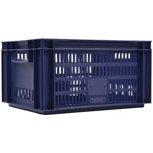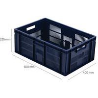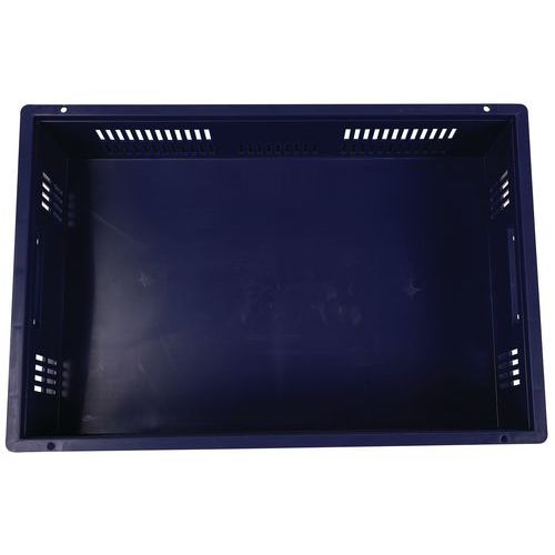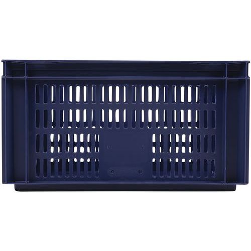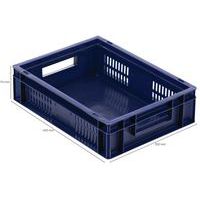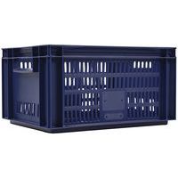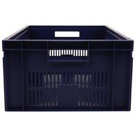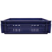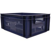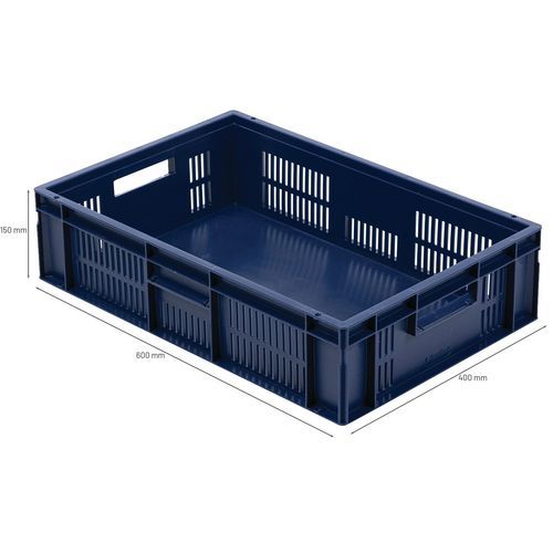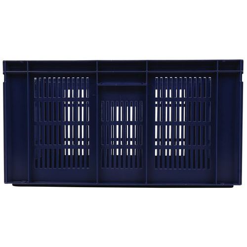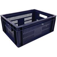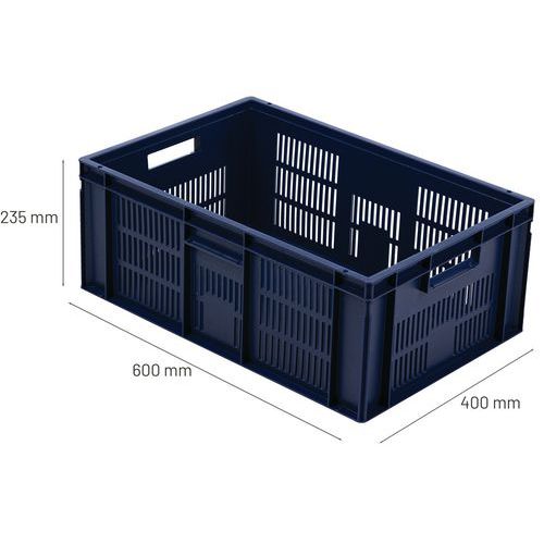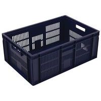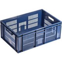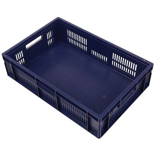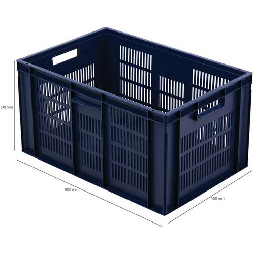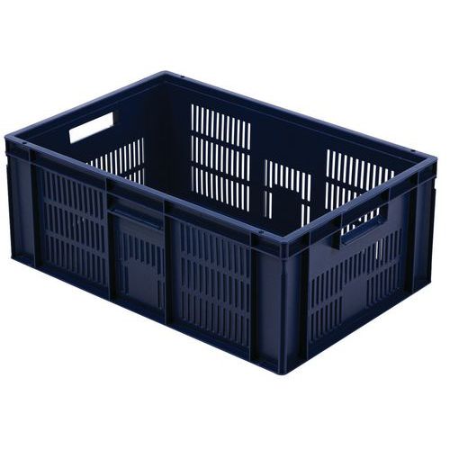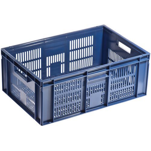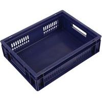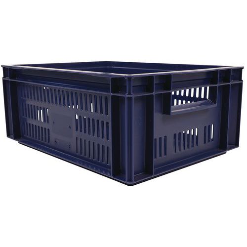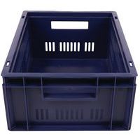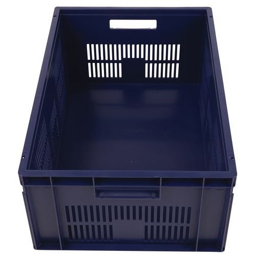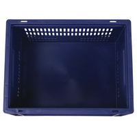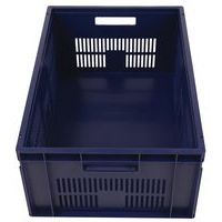 Contenitore a norma europea blu ad alta stabilità adatto all'impilaggio. Ampia ventilazione garantita dalle pareti forate. Facile da maneggiare grazie alle larghe impugnature aperte. Resistente agli oli, ai grassi e a numerosi prodotti chimici.