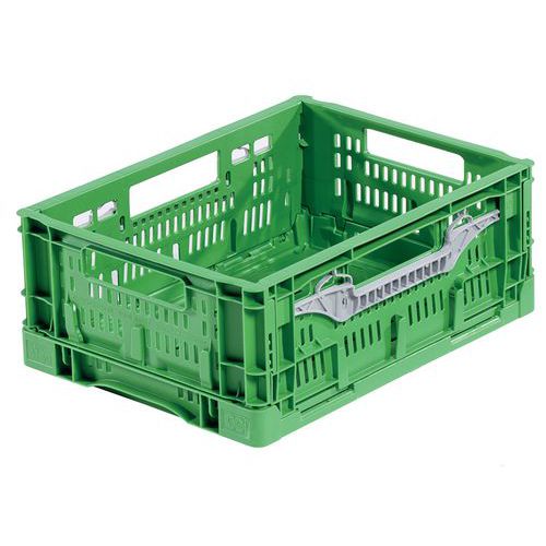 Contenitore pieghevole pratico che consente di ridurre l'ingombro. Struttura rinforzata del fondo e degli angoli per supportare forti carichi quando viene impilato. Facile da aprire e ripiegare grazie alla chiusura ergonomica Lift-Lock. Superfici particolarmente lisce per proteggere la merce. Foratura per una ventilazione ottimale dei prodotti all'interno. Stabile e molto semplice da impilare.