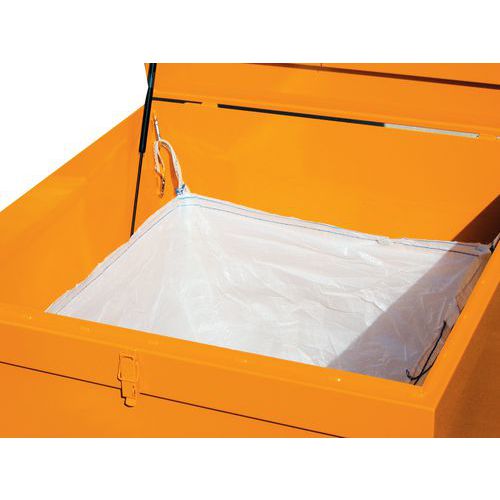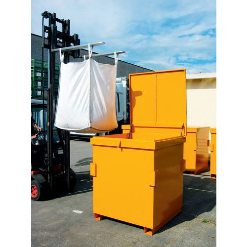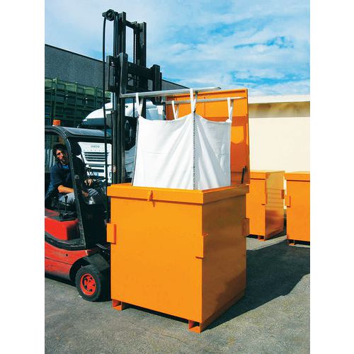 | Descrizione | Contenitore porta big bag con coperchio, Colore: Arancione, Altezza: 1360 mm, Larghezza: 1100 mm |