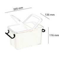 Contenitore in plastica robusta con pareti piene rinforzate su 4 lati. La forma conica garantisce impilamento e incastro perfetti. Accesso laterale facilitato dal coperchio a doppio battente. Contenitore a chiusura efficace con 2 solide impugnature a scatto.
