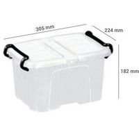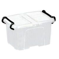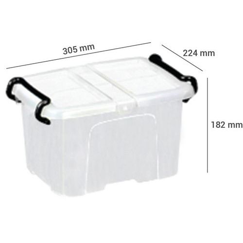 Contenitore in plastica robusta con pareti piene rinforzate su 4 lati. La forma conica garantisce impilamento e incastro perfetti. Accesso laterale facilitato dal coperchio a doppio battente. Contenitore a chiusura efficace con 2 solide impugnature a scatto.