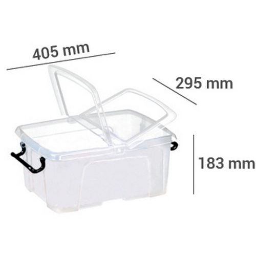 Contenitore in plastica robusta con pareti piene rinforzate su 4 lati. La forma conica garantisce impilamento e incastro perfetti. Accesso laterale facilitato dal coperchio a doppio battente. Contenitore a chiusura efficace con 2 solide impugnature a scatto.