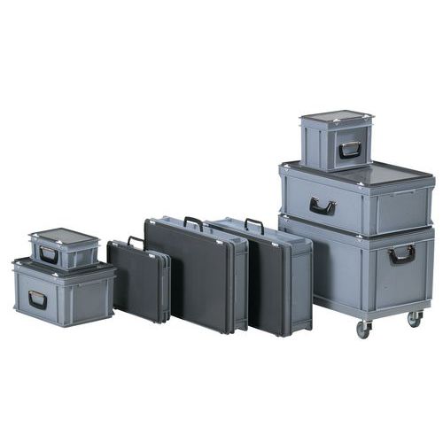 Contenitore a valigetta con coperchio e cerniere a 2 rinforzi. Chiusura con 2 clip a molla. Impilabile senza rischi di scivolamento. Pulizia perfetta grazie alle pareti lisce. Valigetta in plastica con maniglia da trasporto sul lato lungo.