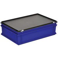 Contenitore impilabile a norma europea con coperchio. Dotato di coperchio a cerniera con rinforzi e 2 chiusure a molla. Due portaetichette sui 2 lati (1 su un lato grande anteriore e 1 su un lato piccolo del contenitore). Realizzato in Francia