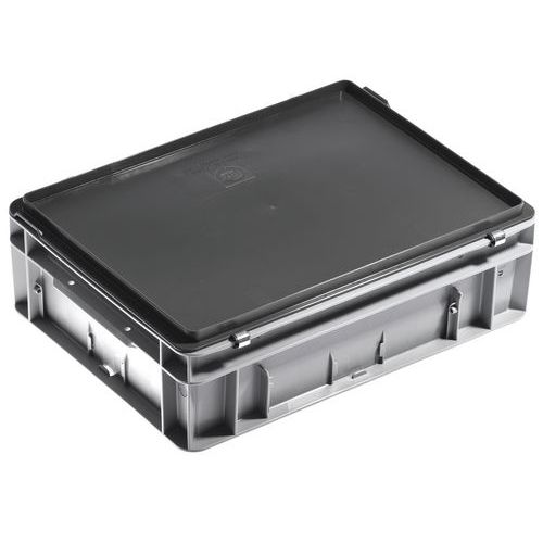 Contenitore impilabile a norma europea con coperchio. Dotato di coperchio a cerniera con rinforzi e 2 chiusure a molla. Due portaetichette sui 2 lati (1 su un lato grande anteriore e 1 su un lato piccolo del contenitore).