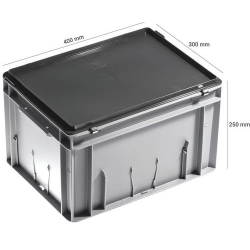 Contenitore impilabile a norma europea con coperchio. Dotato di coperchio a cerniera con rinforzi e 2 chiusure a molla. Due portaetichette sui 2 lati (1 su un lato grande anteriore e 1 su un lato piccolo del contenitore).