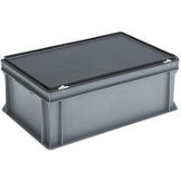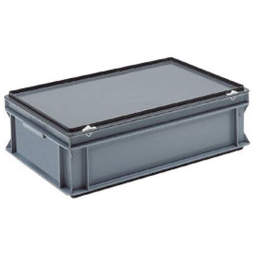 Contenitore impilabile a norma europea con coperchio. Dotato di coperchio a cerniera con rinforzi e 2 chiusure a molla. Due portaetichette sui 2 lati (1 su un lato grande anteriore e 1 su un lato piccolo del contenitore).