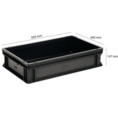 Contenitori impilabili a norma europea in materiale conduttore, dotato di pareti piene, fondo pieno o compatto e manici a conchiglia o pieni.