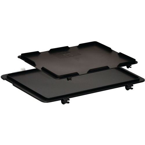 Coperchio impilabile a norma europea in materiale conduttore disponibile in diverse dimensioni in nero. Alcuni coperchi sono dotati di due cerniere montate su un lato grande (3-215Z-1-11 EL,3-214Z-1-11 EL, 3-213Z-1-11 EL) Su questi stessi modelli, è inoltre possibile aggiungere delle chiusure a molla.
