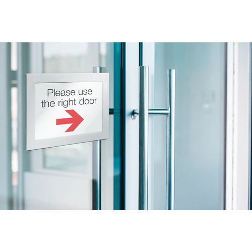 Cornice espositiva adesiva Duraframe® per superfici lisce. Grazie al retro adesivo riposizionabile, la cornice si attacca e stacca su tutte le superfici lisce e rigide, come pareti, porte... Leggibilità fronte-retro del documento su una superficie in vetro. Aggiornamento semplice e rapido, mantenimento dei documenti grazie alla cornice magnetica. Per l'uso nel formato verticale o orizzontale. Soluzione ideale per affiggere informazioni generali e obbligatorie aziendali, promozioni, regolamenti interni, note informative, ecc.