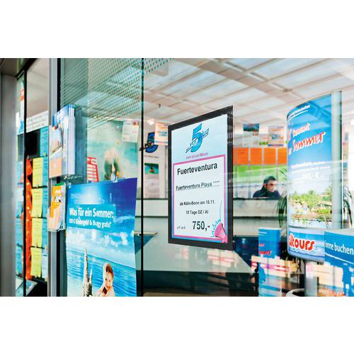 Cornice espositiva adesiva Duraframe® per superfici lisce. Grazie al retro adesivo riposizionabile, la cornice si attacca e stacca su tutte le superfici lisce e rigide, come pareti, porte... Leggibilità fronte-retro del documento su una superficie in vetro. Aggiornamento semplice e rapido, mantenimento dei documenti grazie alla cornice magnetica. Per l'uso nel formato verticale o orizzontale. Soluzione ideale per affiggere informazioni generali e obbligatorie aziendali, promozioni, regolamenti interni, note informative, ecc.