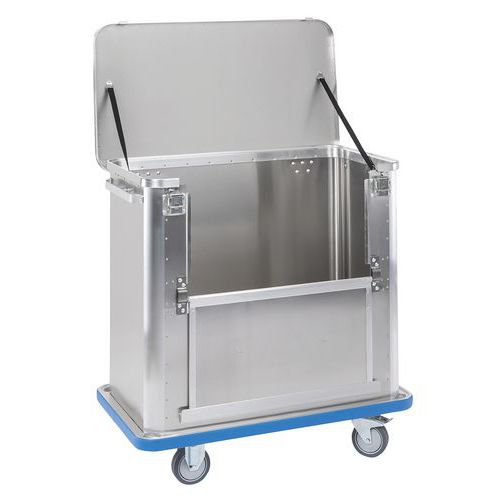 Carrello contenitore in alluminio per un utilizzo universale. Igienico, inodore e non arrugginisce. Utilizzo facile ed ergonomico, anche con carichi massimi. Superficie liscia, sponda non scanalata per una semplice pulizia. Sponda ribaltabile con blocco in posizione aperta grazie a due magneti. Coperchio a cerniere, 2 cinghie di sostegno e 2 chiusure a leva. Fondo inclinato con 2 fori di evacuazione dotati di valvola di sfiato, tappo e catenella. Fondo impermeabilizzato con silicone. Maniglie anodizzate sulle due sponde frontali.