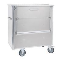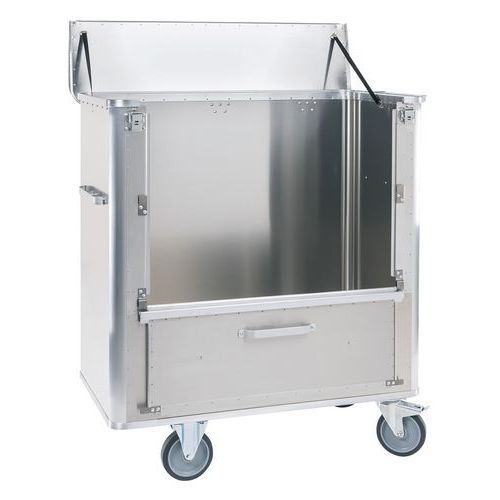 Carrello contenitore in alluminio per un utilizzo universale. Igienico, inodore e non arrugginisce. Utilizzo facile ed ergonomico, anche con carichi massimi. Superficie liscia, sponda non scanalata per una semplice pulizia. Sponda ribaltabile con blocco in posizione aperta grazie a due magneti. Coperchio a cerniere, 2 cinghie di sostegno e 2 chiusure a leva. Fondo inclinato con 2 fori di evacuazione dotati di valvola di sfiato, tappo e catenella. Fondo impermeabilizzato con silicone. Maniglie anodizzate sulle due sponde frontali.