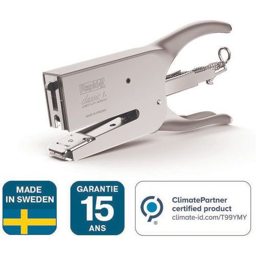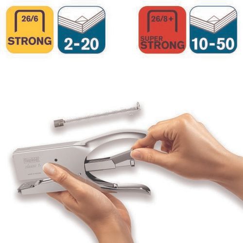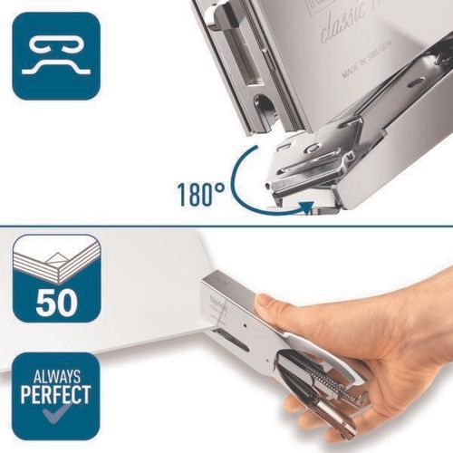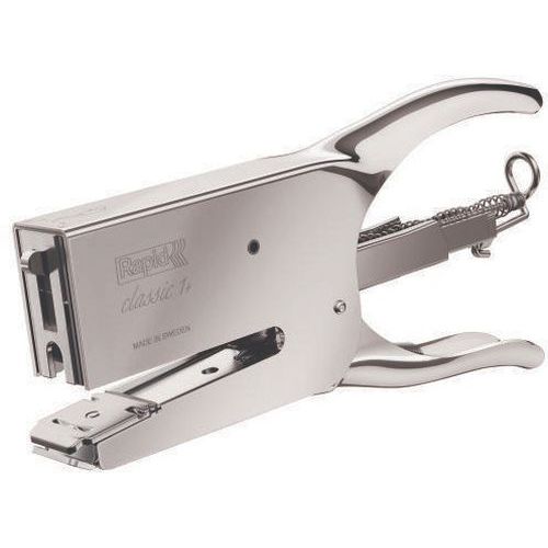 Spillatrice Classic K1 cromata per una pratica cucitura e pinzatura dei documenti. Consente di pinzare molti documenti in una sola volta grazie a un meccanismo in acciaio robusto e affidabile. Grazie alla doppia funzione di cucitura/pinzatura, è possibile regolare l'incudine in base alle proprie esigenze per un fissaggio temporaneo o permanente. Comodo caricamento posteriore, facile sostituzione dei punti Rapid n°26 (26/6 punti Strong o 26/8+ Superstrong) per un risparmio di tempo ottimale.