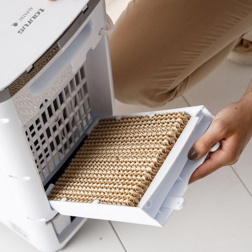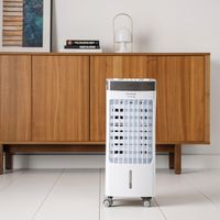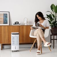 Deodorante per ambienti bianco e grigio - R 403. Potenza: 80 W. 3 funzioni in 1: profuma, rinfresca, umidifica. Portata dell'aria: 270 m3/ora. 3 velocità di ventilazione. Oscillazione orizzontale delle alette. Doppio serbatoio dell'acqua per una maggiore efficienza. Potenza acustica: 65 dB(A). Filtro antipolvere lavabile.