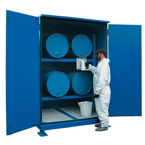 Scaffalatura interna fornita di serie, permette di realizzare una stazione di travaso integrabile con i supporti per taniche e i supporti girevoli per fusti, entrambi da richiedere separatamente.