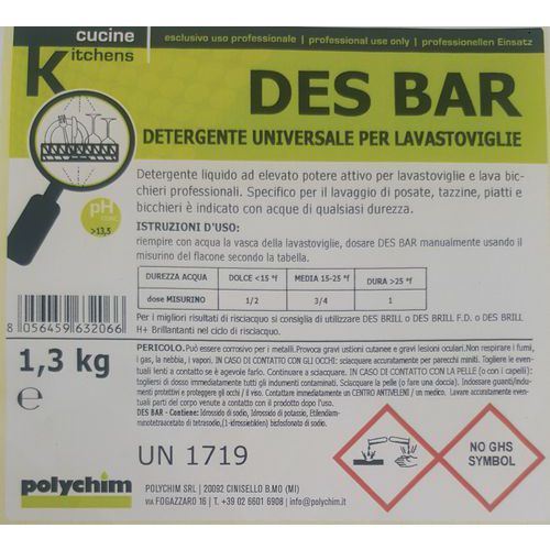 | Descrizione | Detergente liquido per lavastoviglie DES BAR, Confezionamento: 6 x 1,3 kg |