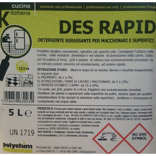 | Descrizione | Detergente rapido per superfici DES RAPID, Profumo: Agrumato, Confezionamento: 4 x 5 L |