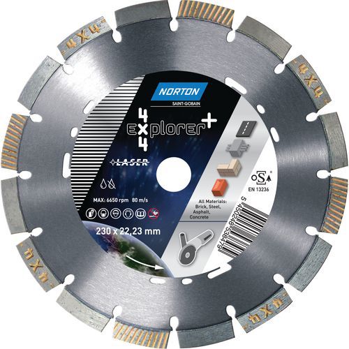 | Descrizione | Disco diamantato per taglio 4 x 4 Explorer, Alesaggio Ø: 25.4 mm, Ø: 300 mm, Per materiale: Cemento armato |