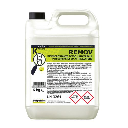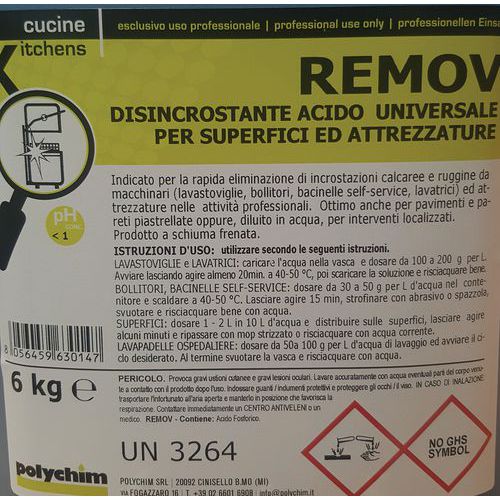 | Descrizione | Disincrostante acido a bassa schiuma REMOV, Confezionamento: 4 x 6 kg |