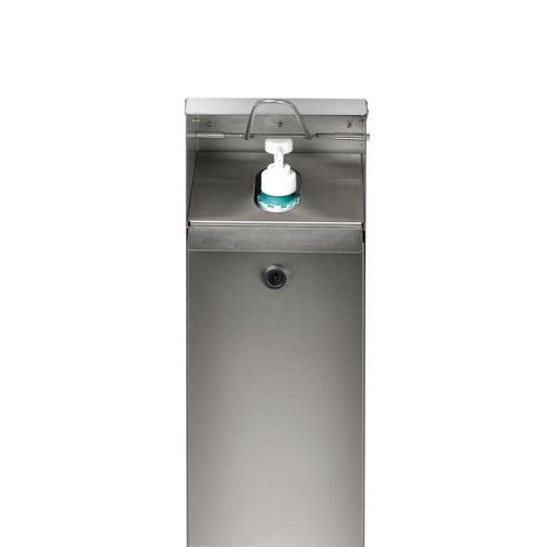 - Dispenser lavamani igienico senza pattumiera con meccanismo di azionamento igienico tramite gomito.