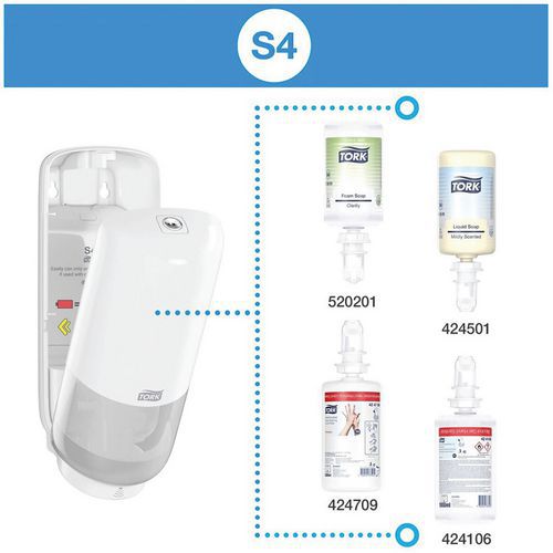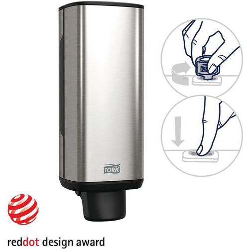 | Descrizione | Dispenser di sapone Tork in alluminio S4, Tipo di ricarica: Cartuccia, Comando distributore: Pulsante |