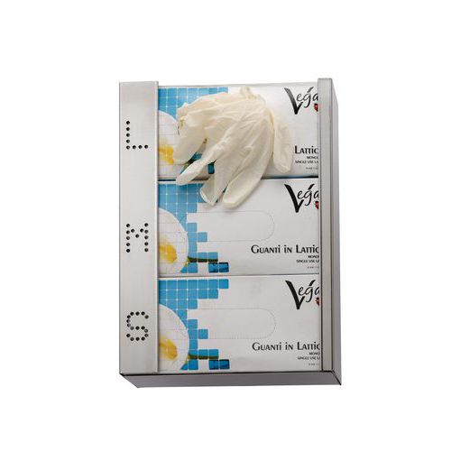 | Descrizione | Distributore guanti monouso in acciaio inox, Colore: Grigio, Altezza: 350 mm, Larghezza: 245 mm |
