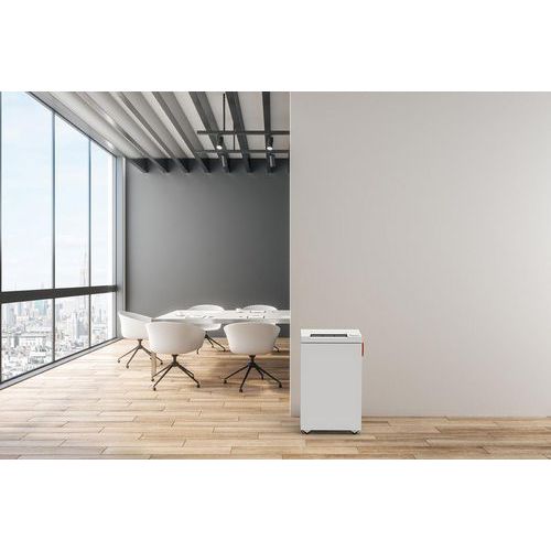 Distruggidocumenti con sistema di protezione e di sicurezza. Smile luminosi che indicano la capacità massima del distruggidocumenti, evitando gli inceppamenti. Blocco di taglio in acciaio speciale, robusto e sicuro, che distrugge anche carte di credito e graffette. Avvio/arresto automatico mediante fotocellula. Mobile in legno con ante, montato su ruote. Contenitore con comoda maniglia per il trasporto. Ideale per il telelavoro