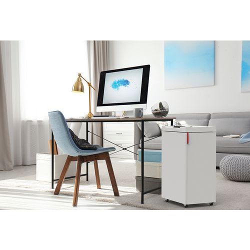 Distruggidocumenti con sistema di protezione e di sicurezza P-4. Smile luminosi che indicano la capacità massima del distruggidocumenti, evitando gli inceppamenti. Blocco di taglio in acciaio speciale, robusto e sicuro, che distrugge anche carte di credito, CD e graffette. Avvio/arresto automatico mediante fotocellula. Mobile in legno con ante, montato su ruote. Contenitore con comoda maniglia per il trasporto. Ideale per il telelavoro
