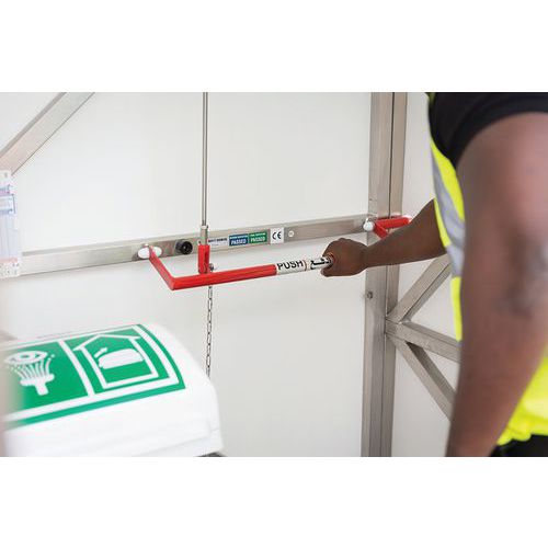 Doccia di sicurezza con serbatoio da 350 L isolato con lavaocchi/viso. Ideale per un utilizzo in ambienti pericolosi e non. Fornisce un flusso costante di acqua potabile per diversi minuti, anche in assenza di rete idrica. L'isolamento termico mantiene una temperatura costante dell'acqua nel serbatoio. Semplice attivazione della doccia grazie alla barra anti-panico.