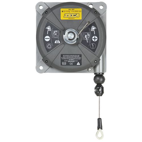 Equilibratore di carico Zeca con struttura in alluminio stampato. Regolazione continua del carico dal valore massimo al valore minimo. Lunghezza del cavo facilmente regolabile per qualsiasi esigenza. Quattro punti di sospensione e tre di ancoraggio.