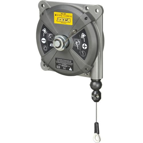Equilibratore di carico Zeca con struttura in alluminio stampato. Regolazione continua del carico dal valore massimo al valore minimo. Lunghezza del cavo facilmente regolabile per qualsiasi esigenza. Quattro punti di sospensione e tre di ancoraggio.