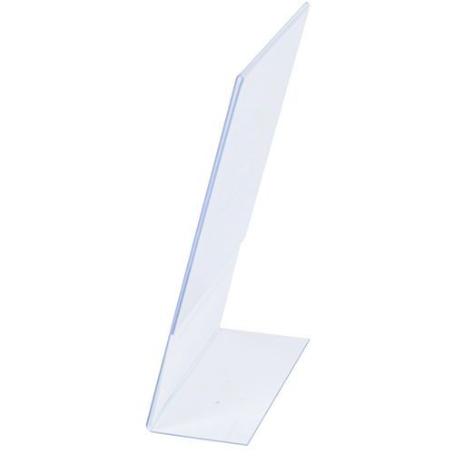 Espositore da tavolo trasparente forma a L inclinato, si posiziona agevolmente su una superficie piana. Con apertura laterale, per ridurre l'ingresso di polvere o umidità. Espositore da tavolo stabile. Facile inserimento del documento.