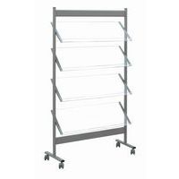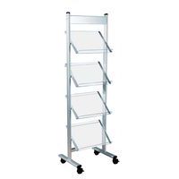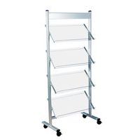 Espositore per brochure con intelaiatura in acciaio. Provvisto di 4 doppie rotelle girevoli con freno. Ripiani in vetro acrilico di qualità superiore.