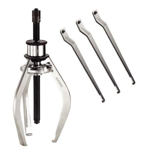 Versatile: montaggio a 2 o 3 pinze. Comfort: estrattore con pinze autobloccanti mediante molla di richiamo. L'estrattore rimane in posizione sul cuscinetto anche se non è sotto tensione. Sicurezza: pinze bloccate in posizione sul cuscinetto utilizzando una rotella zigrinata. Vite a testa fusibile: una coppiglia si rompe in caso di superamento della coppia ammessa. Set di 3 coppiglie di ricambio.