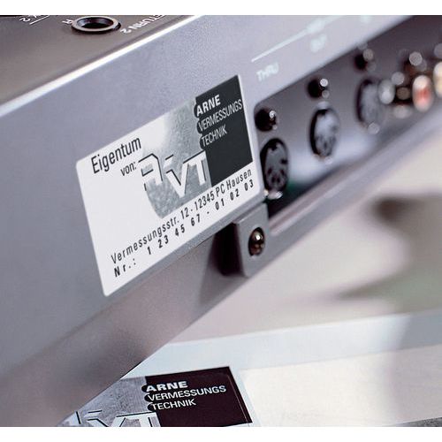 Etichetta in tessuto inalterabile e indistruttibile. Maggiore resistenza a sporco, olio, raggi UV e umidità. Temperature tollerate: da -20 a +80 °C. Supporti multipli: legno verniciato, metallo grezzo o verniciato, vetro e plastica liscia.