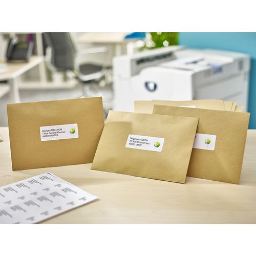 Etichetta riciclata sbiancata senza cloro, facile da scollare dal supporto. Compatibile con tutte le marche di stampanti laser. Angoli arrotondati.