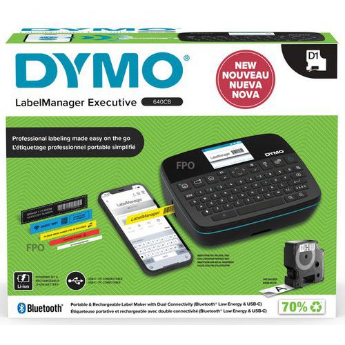 Etichettatrice professionale LabelManager® Executive LM640 CB QWY - Dymo multiuso. Etichettatrice portatile e ricaricabile con doppia connettività. Compatibile con le etichette D1 Standard e Durable, con larghezza di 6, 12, 19 e 24 mm. Portatile senza sforzo grazie a una batteria agli ioni di litio ricaricabile. Design a basso ingombro con dimensioni compatte e una superficie testurizzata per una presa ergonomica.