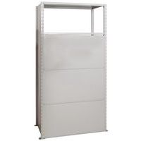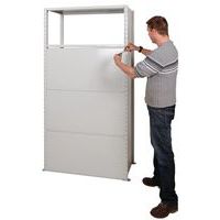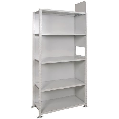 Pannello posteriore solido in lamiera piena galvanizzata. Stabilizza e rinforza la struttura della scaffalatura. Da inserire nei montanti con l'aiuto di ganci. Resina epossidica grigio chiaro, RAL 7035.