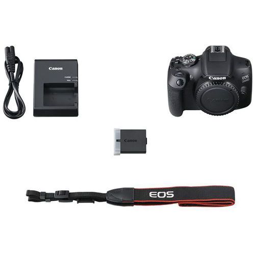 Contenuto della confezione: - Canon EOS 2000D - Canon LP-E10 - Obiettivo EF-S 18-55 mm IS II - Caricabatteria - Parapolvere - Tappo - Tappo per obiettivo - Cinghia per il collo - Cavo USB - Oculare mirino