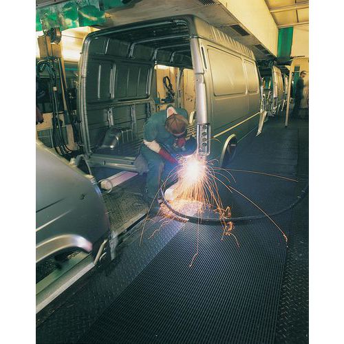 Griglia morbida antiscivolo e antifatica, disponibile al metro. Eccellente drenaggio di liquidi e piccoli detriti. Superficie antiscivolo tipo punta di diamante. Aumento della produttività e stanchezza ridotta. Realizzata in PVC non poroso.