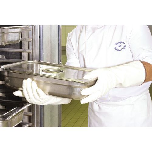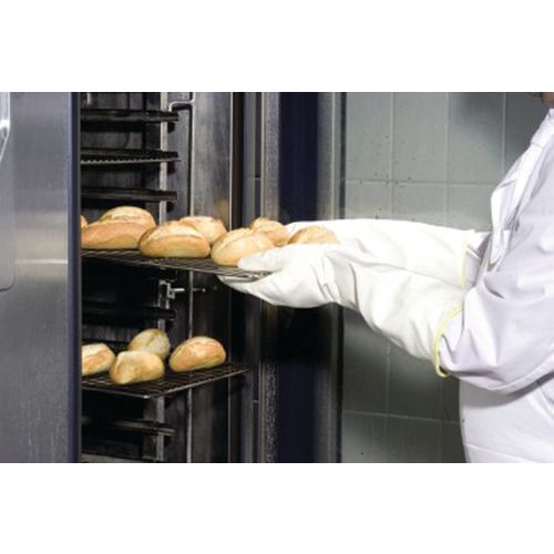 Adatti al contatto con generi alimentari per alcuni tipi di alimenti. Protezione termica fino a 250°C* (*a partire da 150°C, il prodotto può irrigidirsi e il calore può variare ma le prestazioni rimangono inalterate). Manichetta lunga per maneggiare piatti caldi. Resistenza a oli, grassi e prodotti detergenti. Colori conformi agli standard per l'abbigliamento della ristorazione da esterno. Lavabili per una migliore igiene.