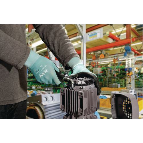 Guanti adatti ai lavori di assemblaggio di pezzi metallici, piccoli lavori di manutenzione o movimentazione leggera. Adatti al contatto con generi alimentari, per alcuni tipi di alimenti. Settori di utilizzo: industria meccanica e lavori di manutenzione. Rivestimento traspirante per una maggiore praticità. Forma anatomica per indossarli facilmente. Durevole e adatto a un uso prolungato. Lavabili 1 volta a 40 °C.