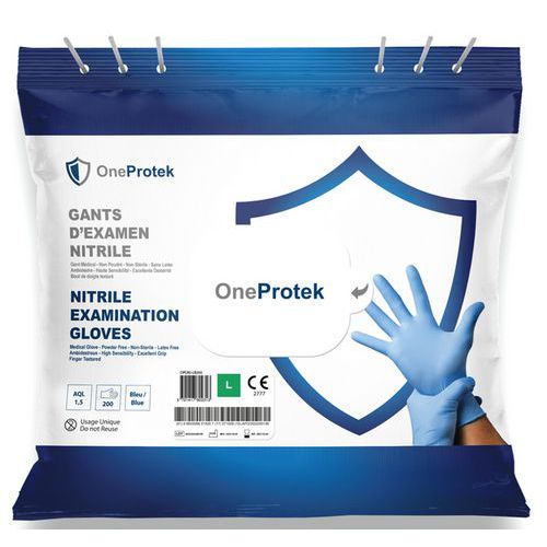Il guanto in nitrile in busta OneProtek è ambidestro e non talcato. Adatto a vari settori di attività, con standard alimentari, chimici e medici. La confezione di guanti OneProtek offre la migliore qualità, ideale per l'industria. In tessuto sulle punta delle dita, il guanto OneProtek offre una buona presa. Senza lattice, non presenta rischi di allergia.