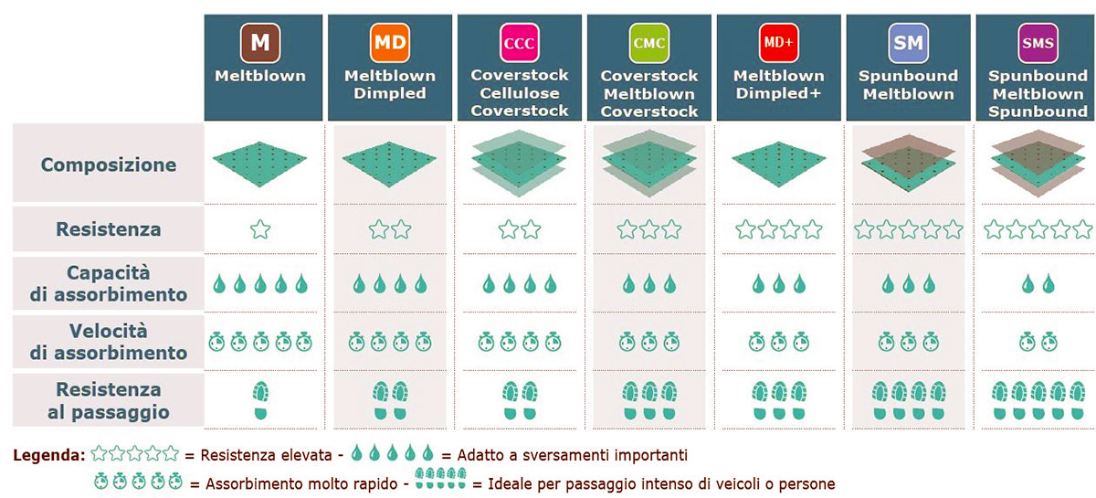 Fogli e rotoli sono prodotti a partire da una particolare lavorazione delle fibre di polipropilene (meltblown) che, a seconda della composizione, determinano i diversi livelli di velocità di assorbimento e di resistenza.