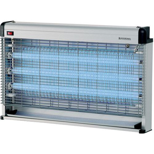 - Corpo in metallo verniciato bianco, alimentazione elettrica da 220 V - 50 Hz, lampade fluorescenti 20 W cad. (E14), vita utile delle lampade: fino a 5.000 ore, raggio d’azione fino a 50 m2 o 120 m2, metodo di cattura con griglia elettrica (3.000 V), possibilità d’installazione a muro, a sospensione o d’appoggio, kit di montaggio e catena inclusi, conforme a norma CE e metodo HACCP, classe di protezione: IP20.