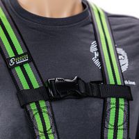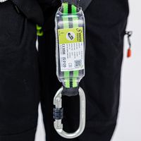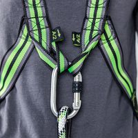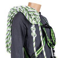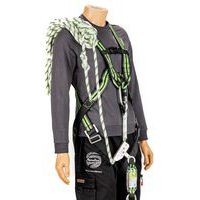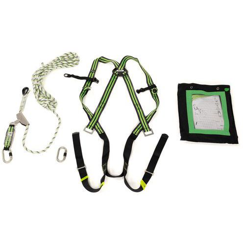 Kit composto da 1 imbracatura anticaduta con 2 punti di ancoraggio, 1 anticaduta scorrevole con assorbitore di energia lungo 10 m, 1 connettore in acciaio con chiusura a vite e apertura da 18 mm, 1 sacco di iuta.